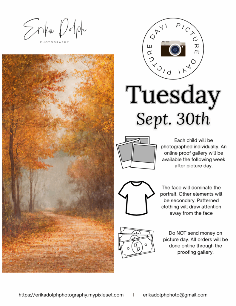 –On September 30th, the school will host Picture Day. See the attachment below for guidelines. Please do not send in any money for picture day.